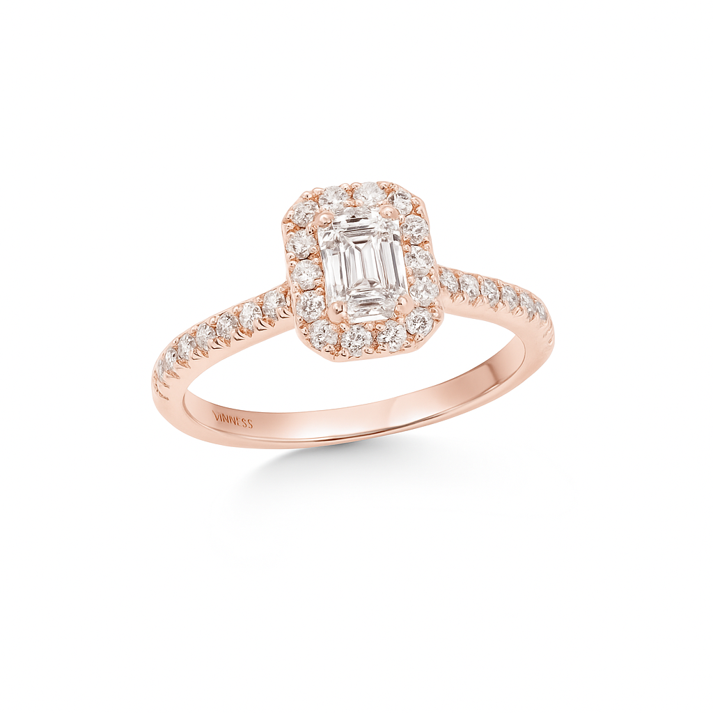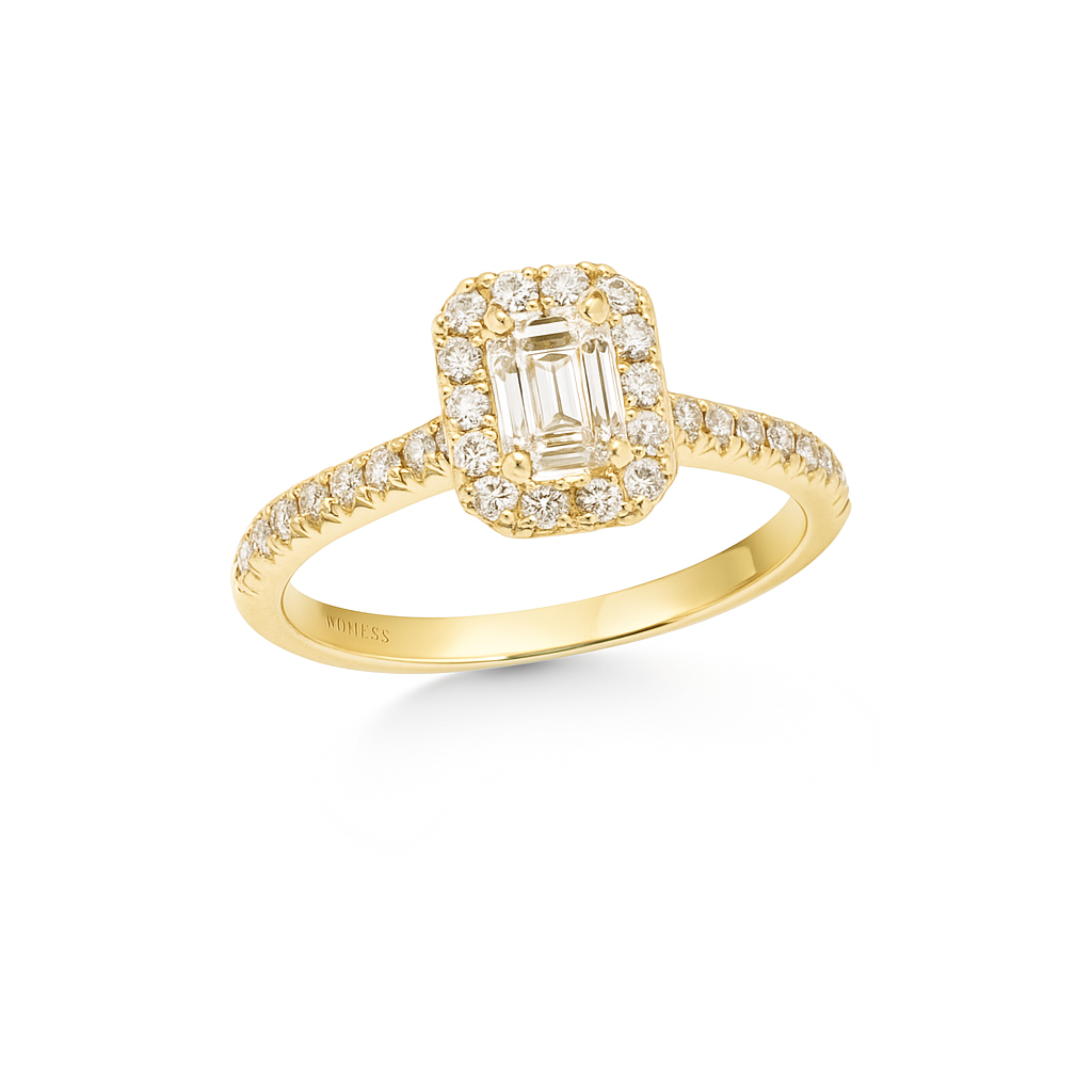 - The set features elegant Prong and French pavé-set diamonds, with dazzling diamond accents decorating the halo and band of the engagement ring.