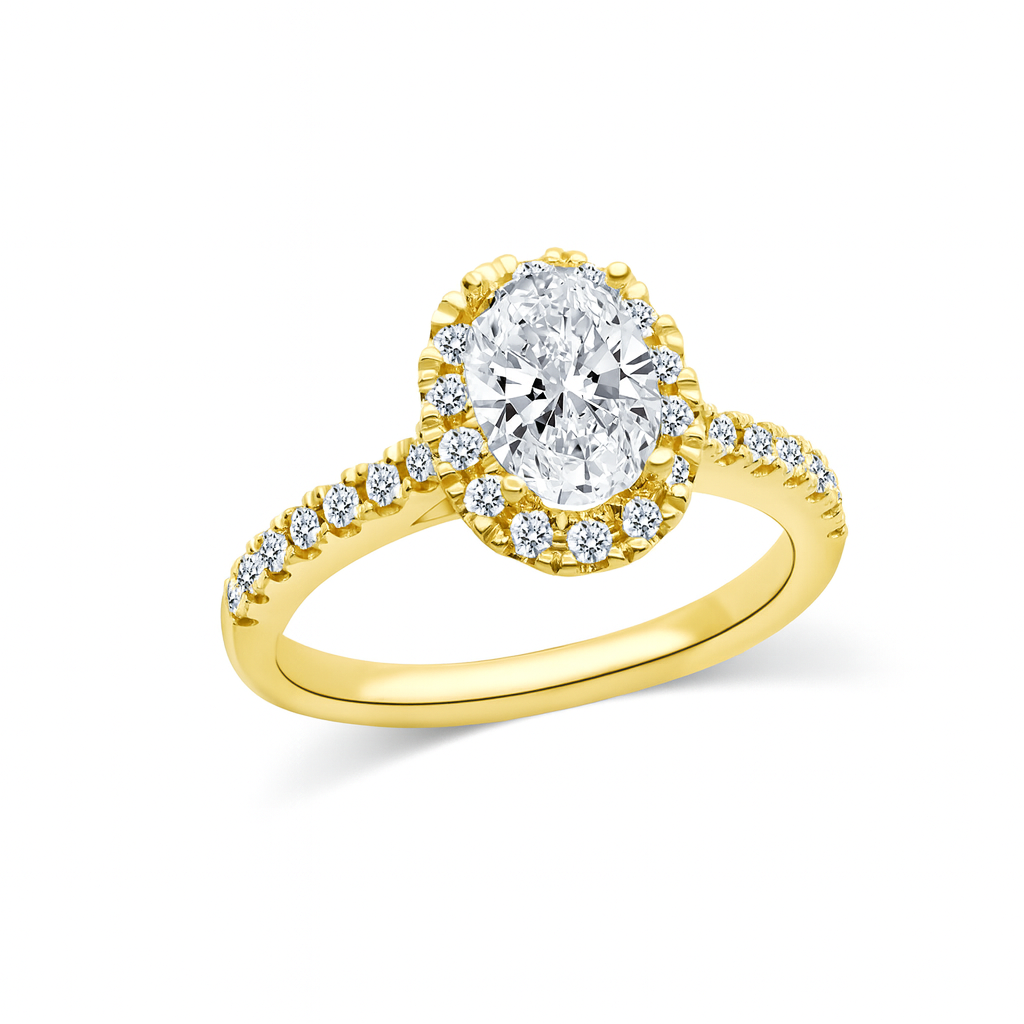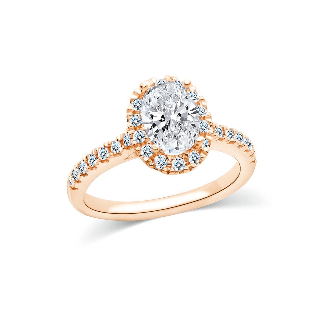 The set features elegant Prong and French pavé-set diamonds, with dazzling diamond accents decorating the halo and band of the engagement ring.