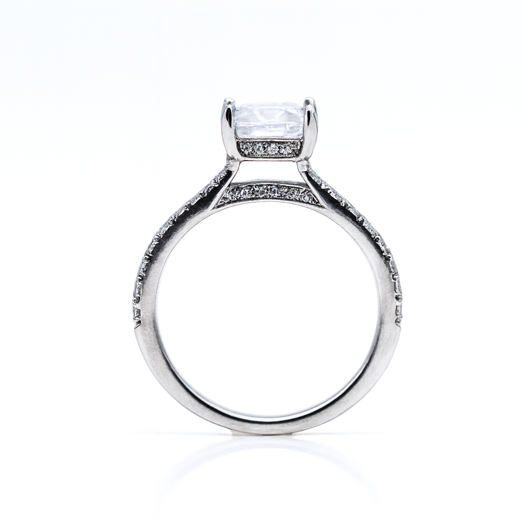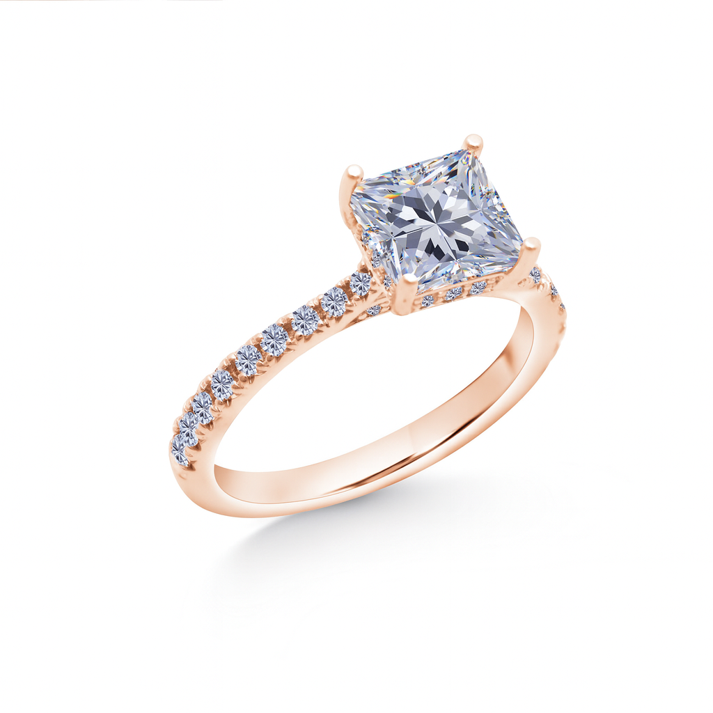 The set features elegant Prong and French pavé-set diamonds, with dazzling diamond accents decorating the halo and band of the engagement ring.