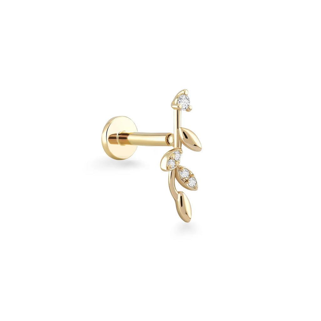 The Ever Green Flat Back Stud is crafted in solid 14k gold, with a stud length of 6.5mm and 1.2mm thickness. The internally threaded stud and secure back allows for a comfortable and strong piercing. Perfect for a statement piece or everyday wear.