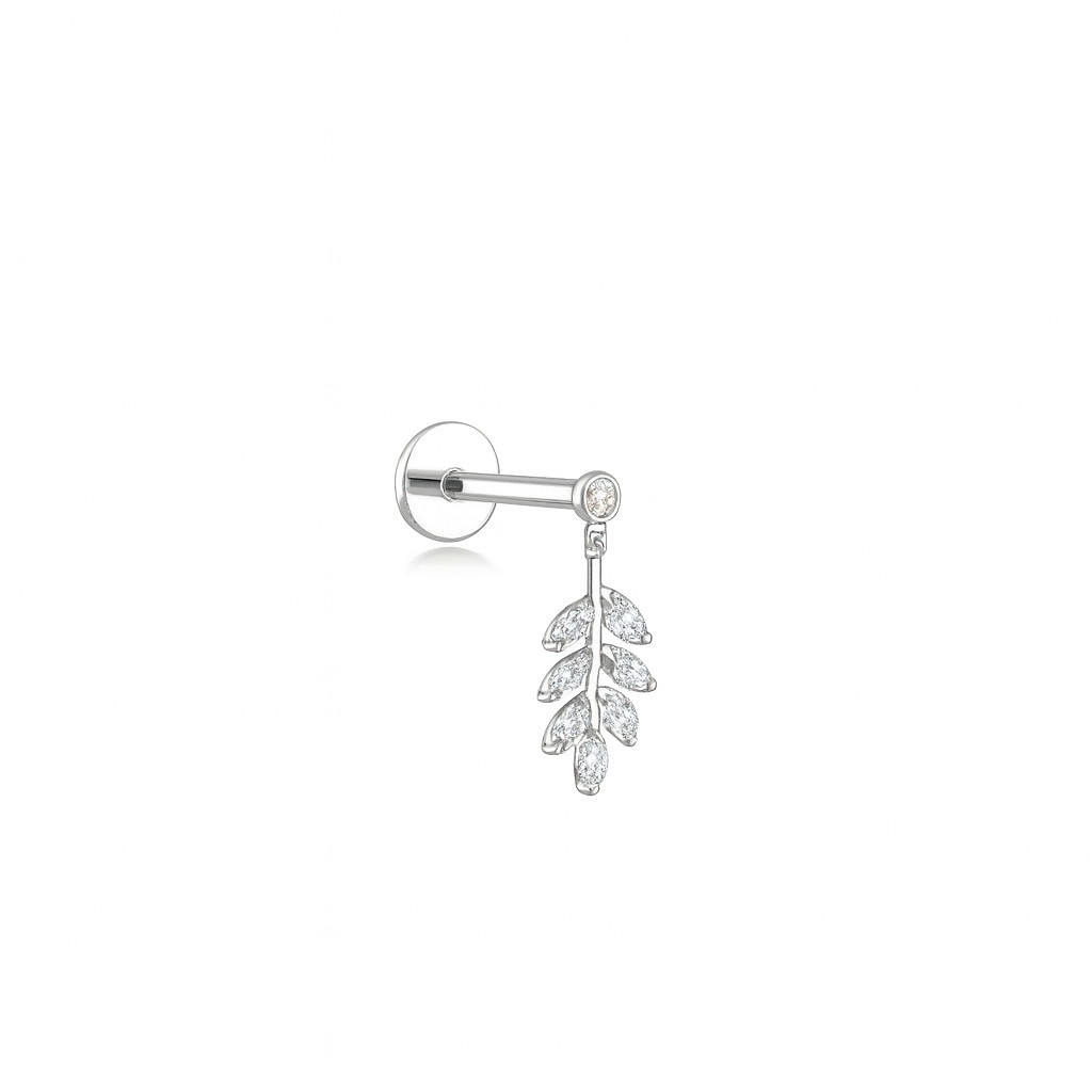 The Olive Branch Piercing is crafted in solid 14k gold, with a stud length of 6.5mm and 1.2mm thickness. The internally threaded stud and secure back allows for a comfortable and strong piercing. Perfect for a statement piece or everyday wear.