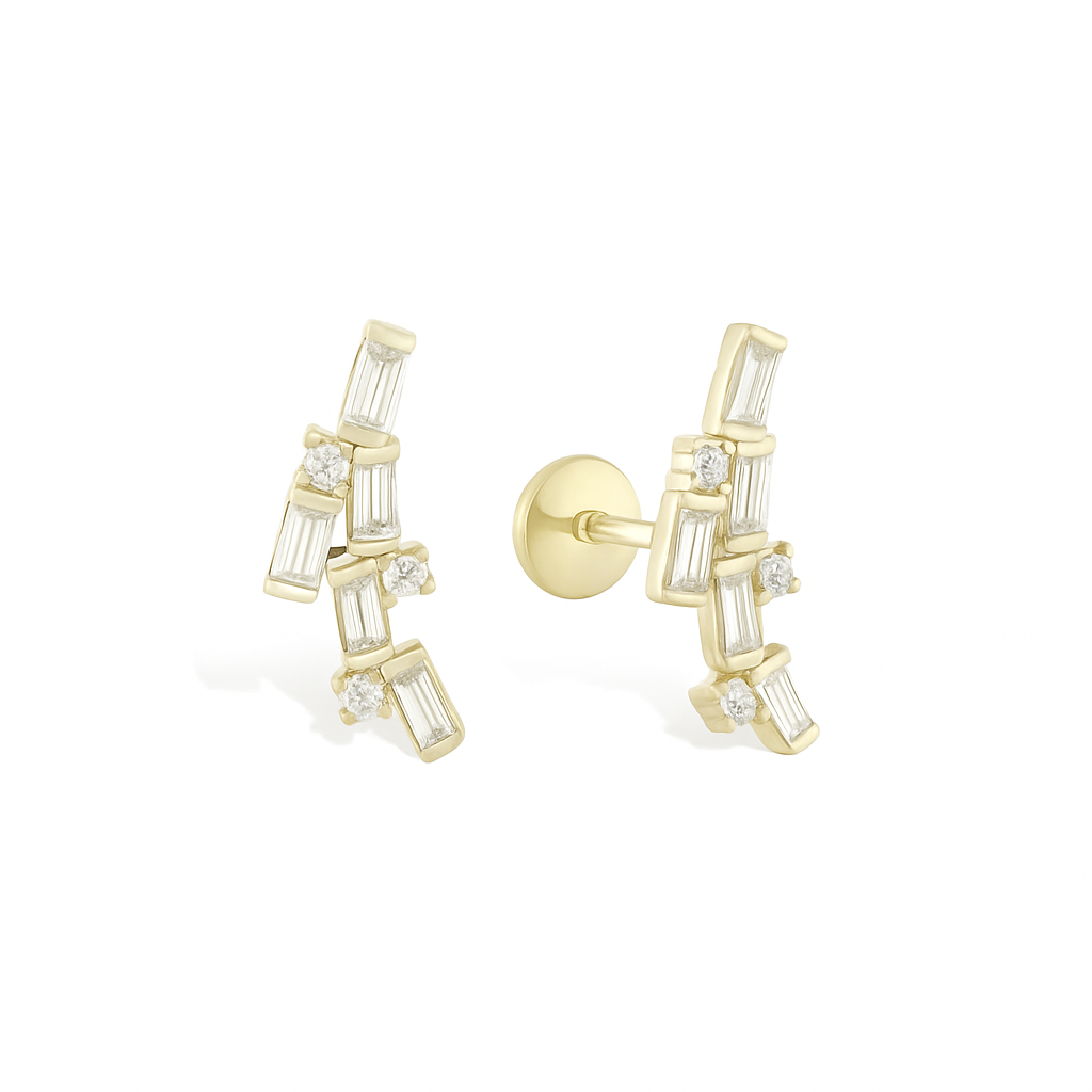 The Snowfall Piercing is crafted in solid 14k gold, with a stud length of 6.5mm and 1.2mm thickness. The internally threaded stud and secure back allows for a comfortable and strong piercing. Perfect for a statement piece or everyday wear.