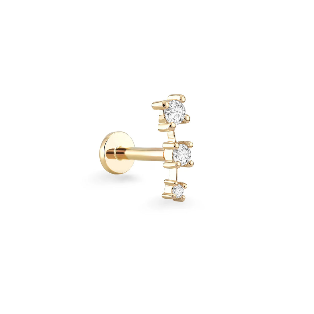 The Diamond Fall Flat Back Stud Piercing is crafted in solid 14k gold, with a stud length of 6.5mm and 1.2mm thickness. The internally threaded stud and secure back allows for a comfortable and strong piercing. Perfect for a statement piece or everyday wear.