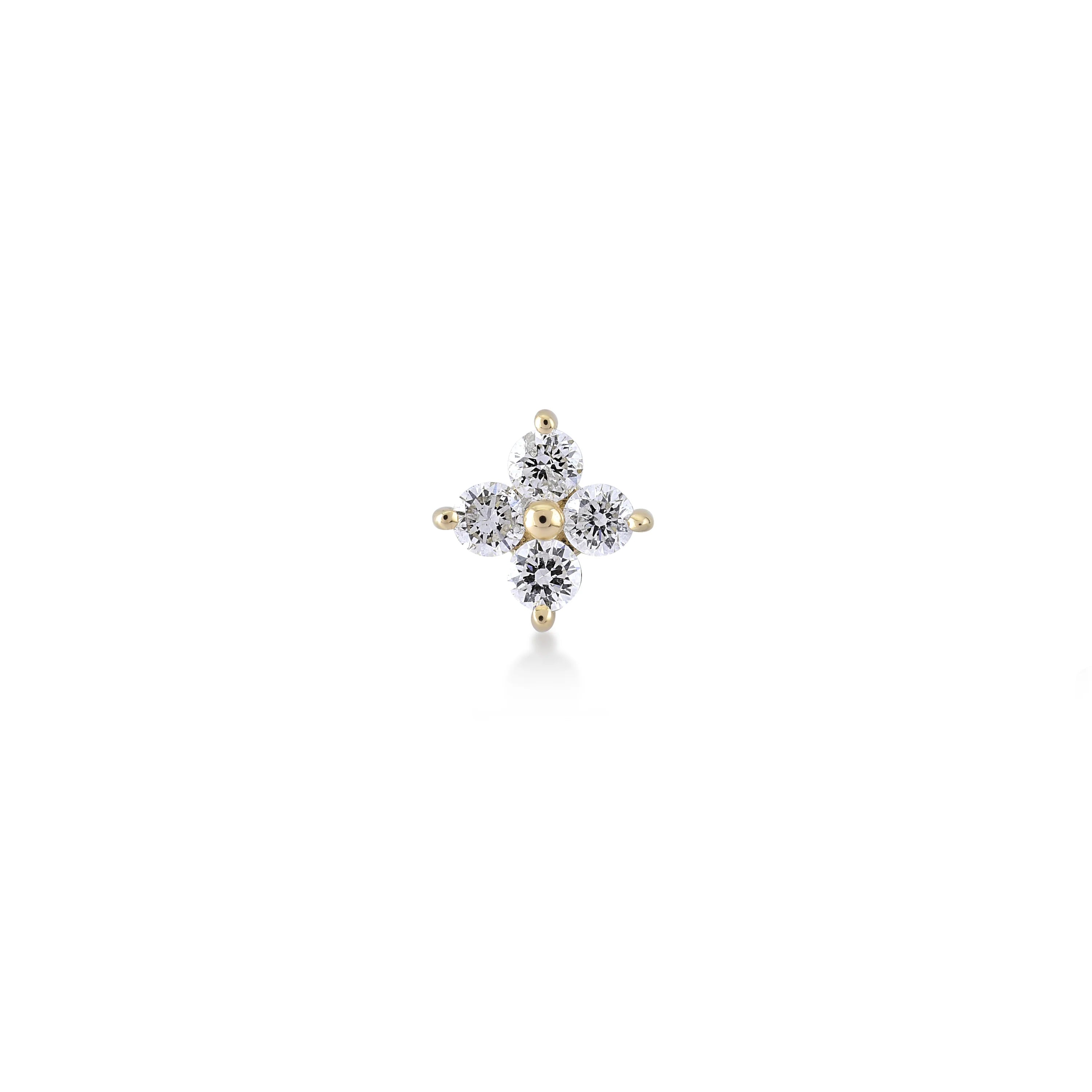 The Quad Diamond Piercing is crafted in solid 14k gold, with a stud length of 6.5mm and 1.25mm thickness. The internally threaded stud and secure back allows for a comfortable and strong piercing. Perfect for a statement piece or everyday wear.