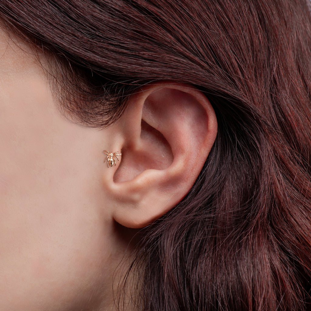 The Scorpaena piercing is crafted in solid 14k gold, with a stud length of 6.5mm and 1.25mm thickness. The internally threaded stud and secure back allows for a comfortable and strong piercing. Perfect for a statement piece or everyday wear.