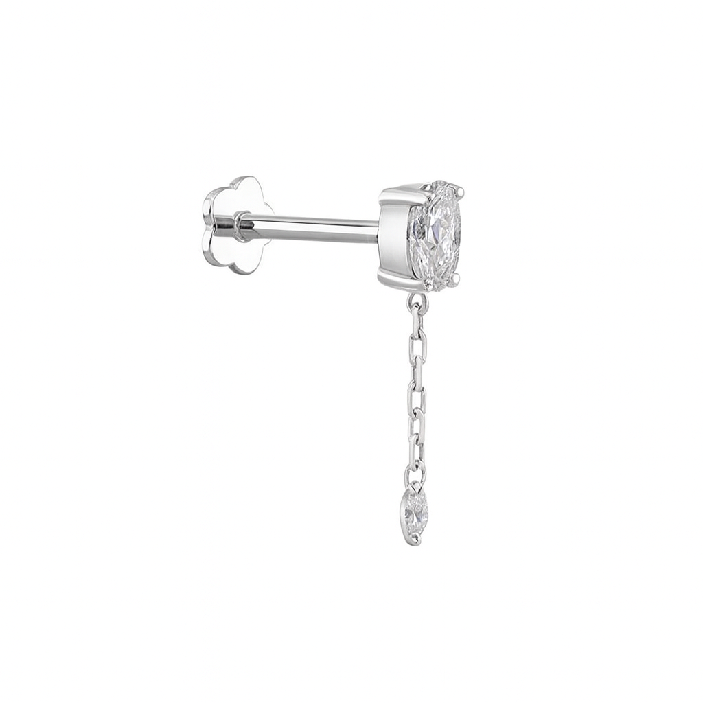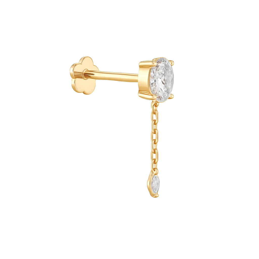 The Suspended Marquise Drop Piercing is crafted in solid 14k gold, with a stud length of 6.5mm and 1.2mm thickness. The internally threaded stud and secure back allows for a comfortable and strong piercing. Perfect for a statement piece or everyday wear.